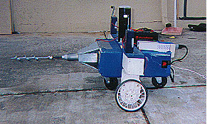 Since this is war, Rodney must have a weapon system. In a home type configuration the weapon could be replaced with a vacuum cleaner or a gripper of some sort. Rodney's weapon is an actuated chainsaw. He has a flipper system that goes up and down. When he starts the flipper is up and the chainsaw is off. When both eyes sense the opponent the program starts the saw, lowers the flipper and charges forward. Once he hits the opponent the mobility sensor senses the stall condition and the program raises the flipper (saw still on) and goes back to search mode. I've built a companion (or sparring partner) for Rodney named Blue Lightning. Blue is the same basic system but with different wheels and a power drill weapon instead of a chainsaw.